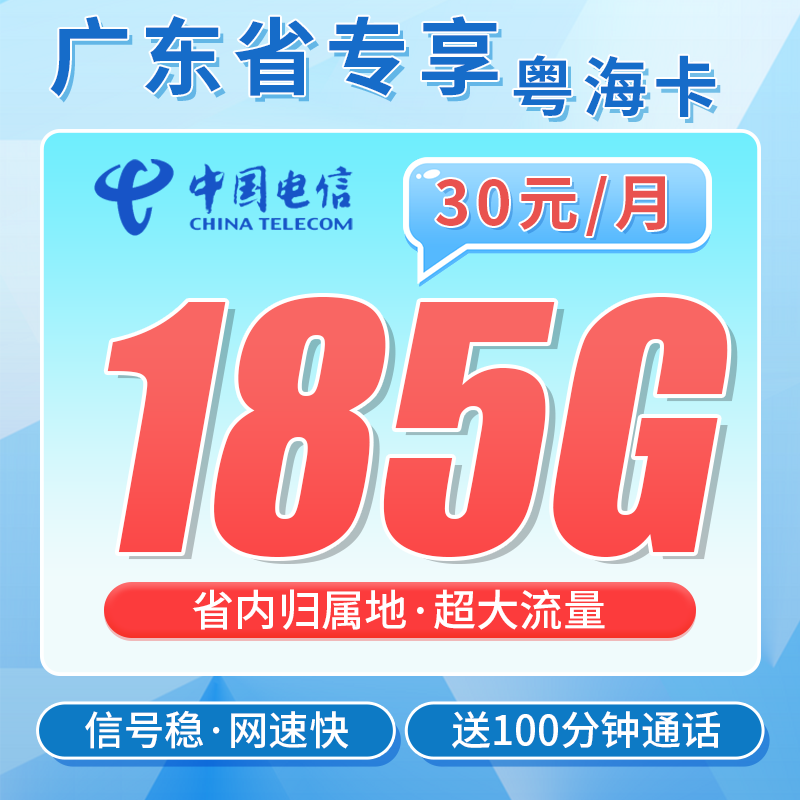 电信粤海卡30元185G全国流量+100分钟+广东专属!