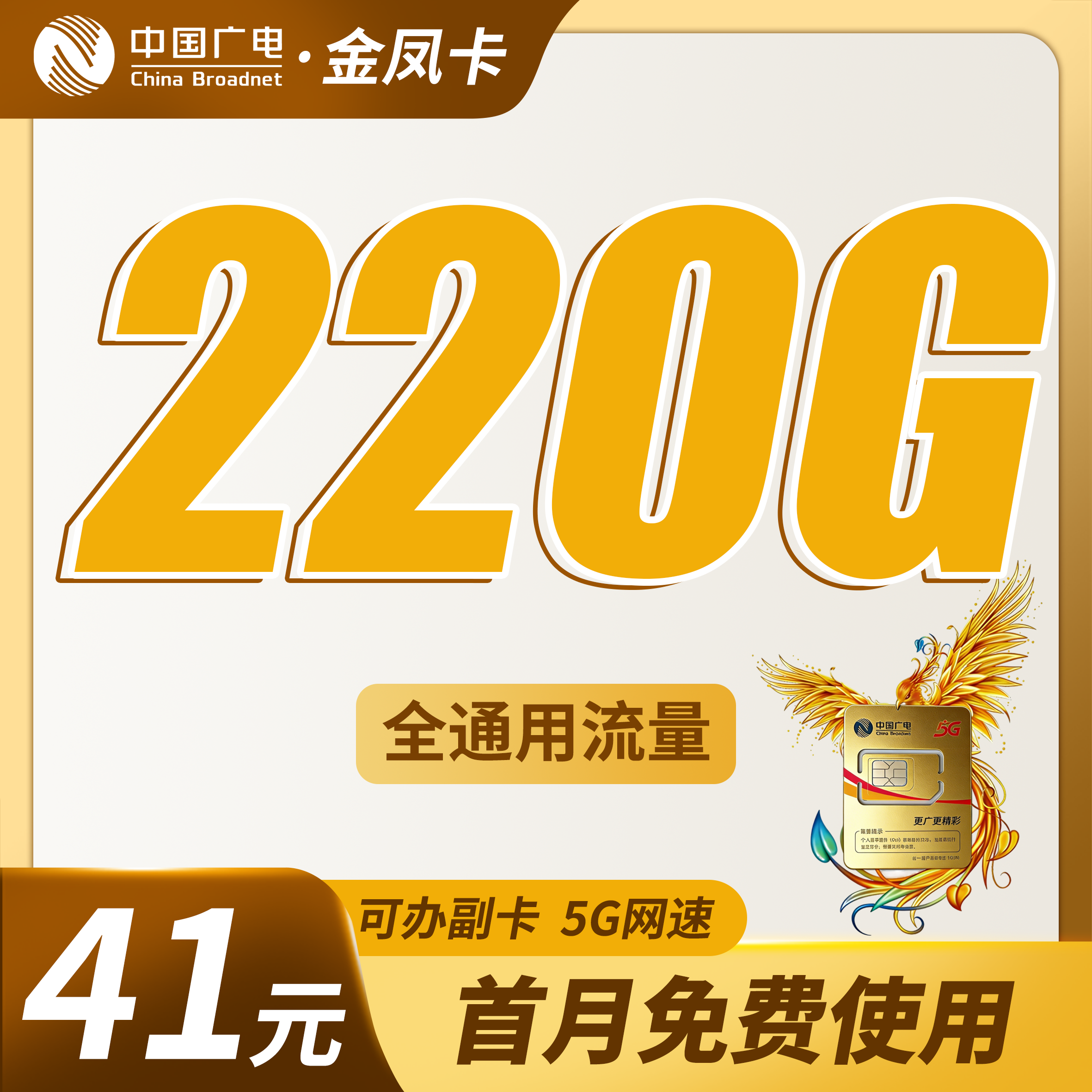 广电金风卡41元220G通用流量+可办副卡+可发全国!